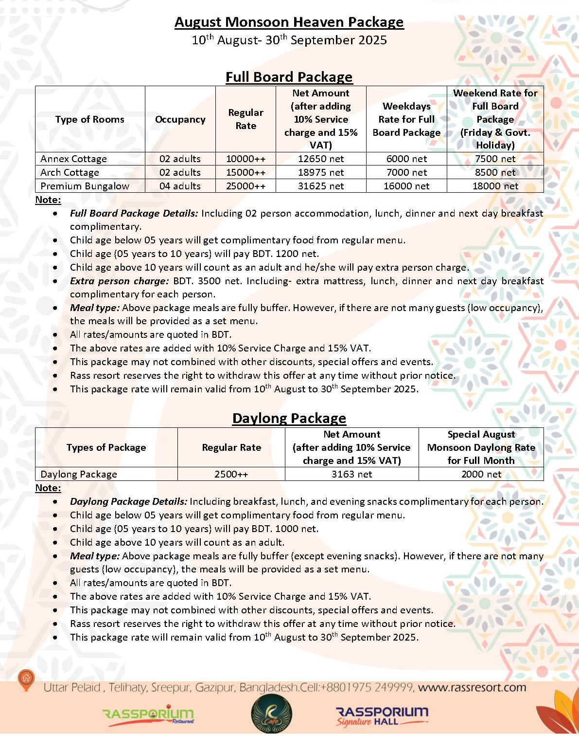 - Extra person charge: BDT. 3500 net. Including- extra mattress, lunch, dinner and next day breakfast complimentary for each person.
